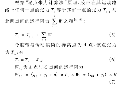 平穩運行。實際的設計計算表明,對于一般的皮帶輸送機凹弧段半徑的計算,式( 1) 的計算結果可滿足要求。但在某些條件下,式( 2) 、( 3) 的計算結果也會大于式( 1) 的所得,從而導致半徑過大給工藝布置帶來一定的困難。查式( 2) 、( 3) ,可采取加大拉緊力的方法以增大Tc值,使其計算結果得到減小。下面將討論凹弧段起始點張力Tc的計算方法。
